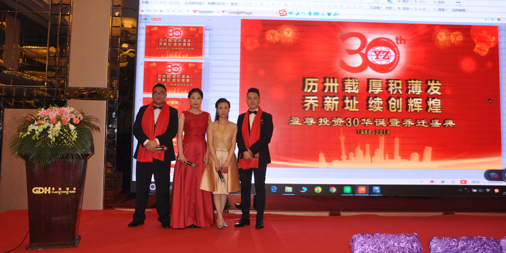 2016年12月28日,盈尊投資30華誕暨喬遷盛典在上海粵海酒店舉行。在新的一年即將到來之際,已在上海的快消品市場沉浮了整整30年的盈尊投資,將遷入全新的辦公大廈(元和投資大廈)。盈尊投資全體員工、供應商伙伴、各行業代表出席盛典,共同見證盈尊的30年來的發展。