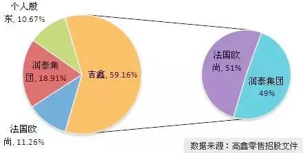 但值得關注的是,在高鑫零售的股權構架中,潤泰和歐尚新組成的合資公司吉鑫成為上市公司高鑫零售的控股股東。其中歐尚持有吉鑫51%股權,潤泰持有49%。吉鑫共持有高鑫零售59.16%股權,高鑫零售則百分之百持有大潤發中國和歐尚中國的內地資產。